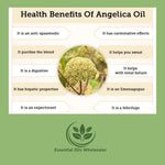 Angelica root oil contains chemicals that might kill cancer cells and fungus, reduce anxiety, and settle the stomach.